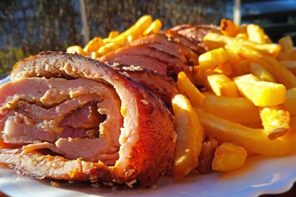 Priprema: Meso rasecite napola, rastanjite tučkom, posolite, pobiberite, premažite uljem i senfom, a potom natrljajte čenovima belog luka. Slaninu i sir isecite na tanke režnjeve, krastavčiće na kolutove, pa ih poređajte po mesu koje ste premazali ajvarom, urolajte ga i zavežite. Prelijte meso ostatkom ulja i čašom belog vina. Stavite u tepsiju, zatvorite folijom i pecite oko dva sata na 180 stepeni. Izvadite iz rerne, meso okrenite, opet zatvorite folijom i vratite u rernu na još sat vremena. Desetak minuta pre završetka pečenja skinite foliju i meso zapecite da dobije finu koricu. Isecite na tanke režnjeve i poslužite.