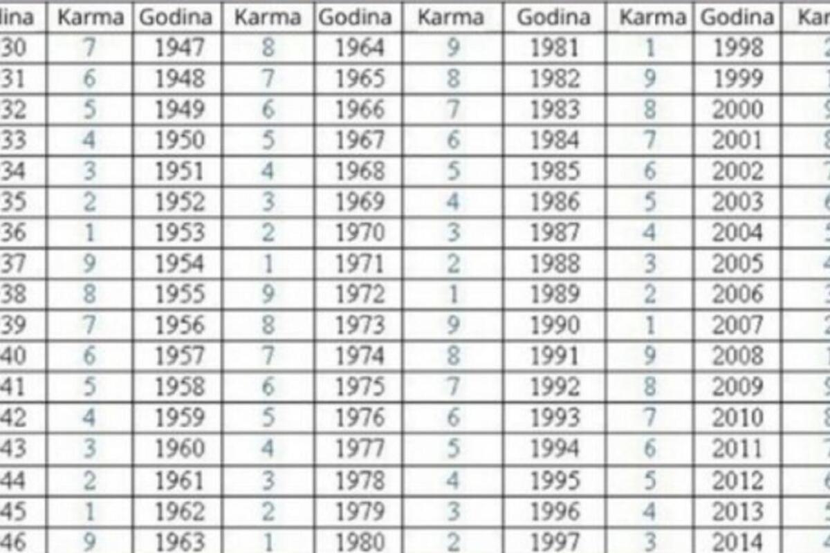 Veruje se da svaka godina rođenja nosi posebnu karmu, ali takođe može pokazati u kojoj ste fazi reinkarnacije. Ako želite malo zabave, u tabeli pronađite godinu svog rođenja, a pored nje je broj karme koji otkriva kakva vas energija prati kroz život, kako da je ispravite i poboljšate.