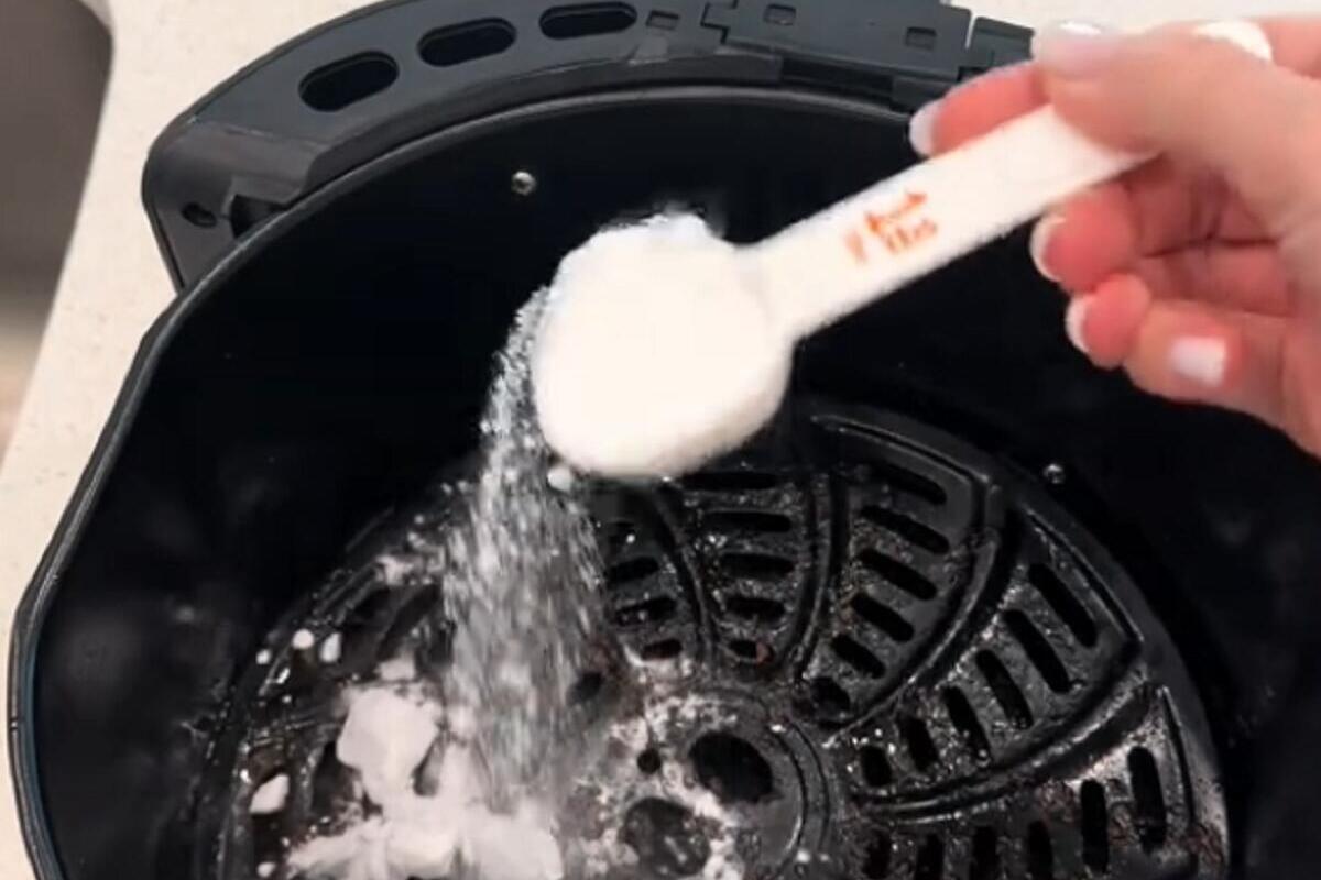 U air fryer ubacite sodu bikarbonu, sirće, malo deterdženta za sudove i potom prelijte vrućom vodom.