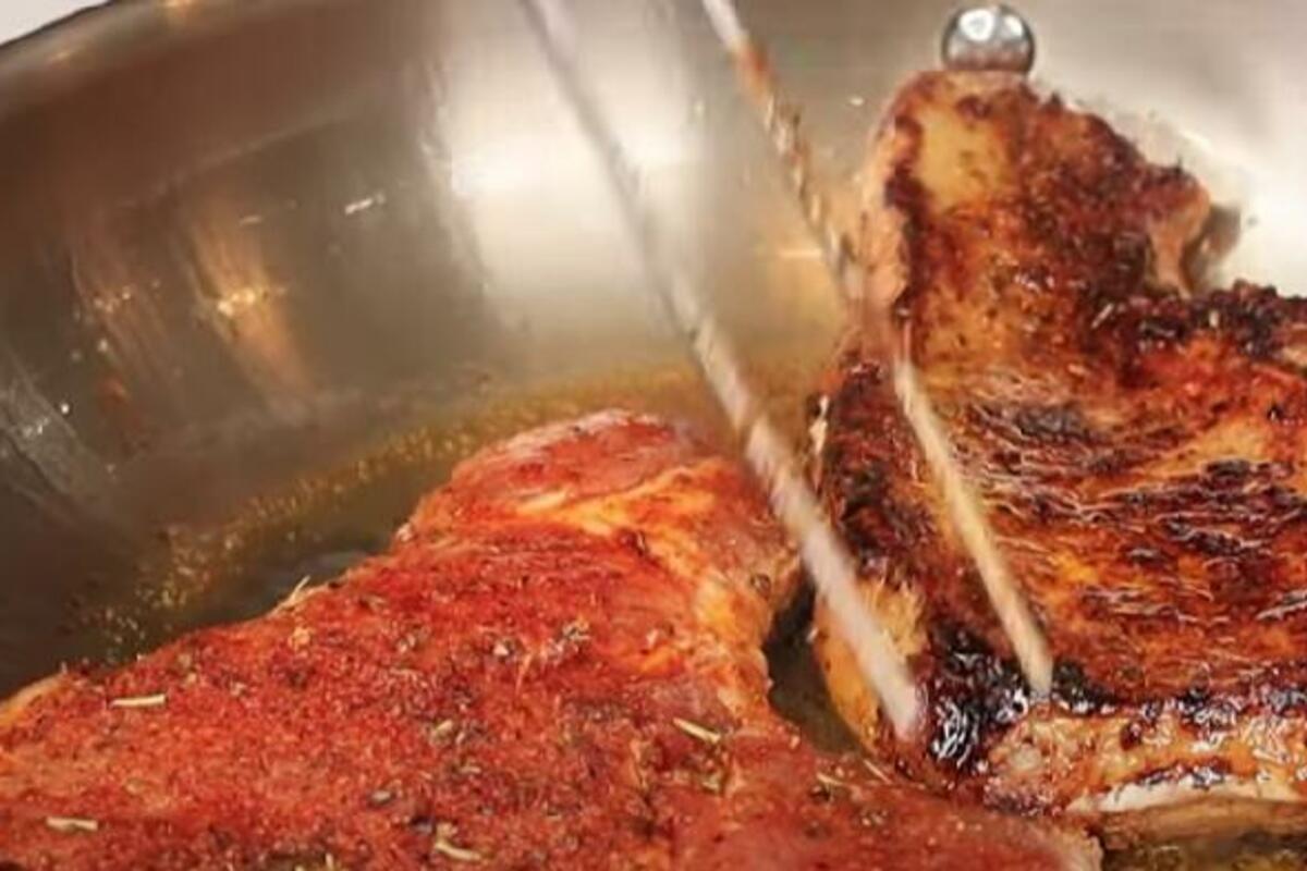 Zagrejte ulje u velikom tiganju na srednje jakoj vatri. U međuvremenu, osušite krmenadle papirnim ubrusima. Sve obilno začinite solju i biberom. Dodajte svinjetinu u tiganj i pržite dok ne dobije zlatno-braon boju na dnu, 4 do 5 minuta. Prebacite na veliki tanjir.