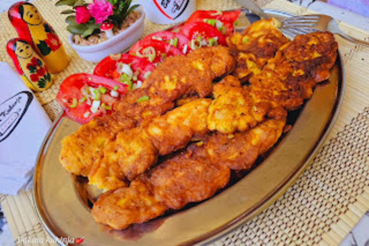 Sve izjednačiti. Meso iseći na tanke kockice pa ubaciti u smesu sa začinima i sve izjednačiti. U tiganj sipati ulje pa kašikom ubacivati po kašku jednu ispod druge čineći veliki uštipk.