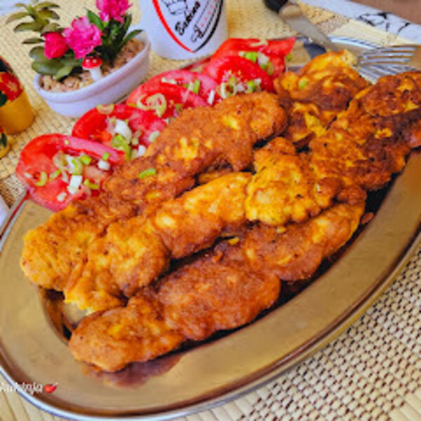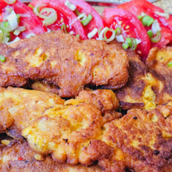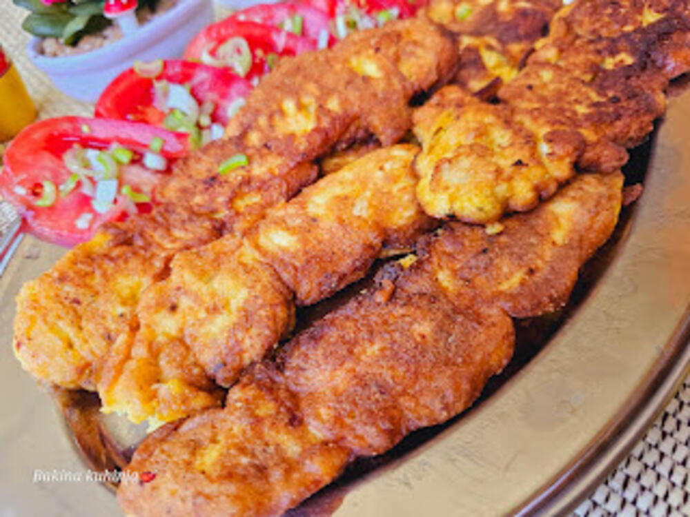 Umutiti jaja dodati pavlaku, malo karija, paprika,ml biber ,beli luk. začin za piletinu brašno i prašak za pecivo.
