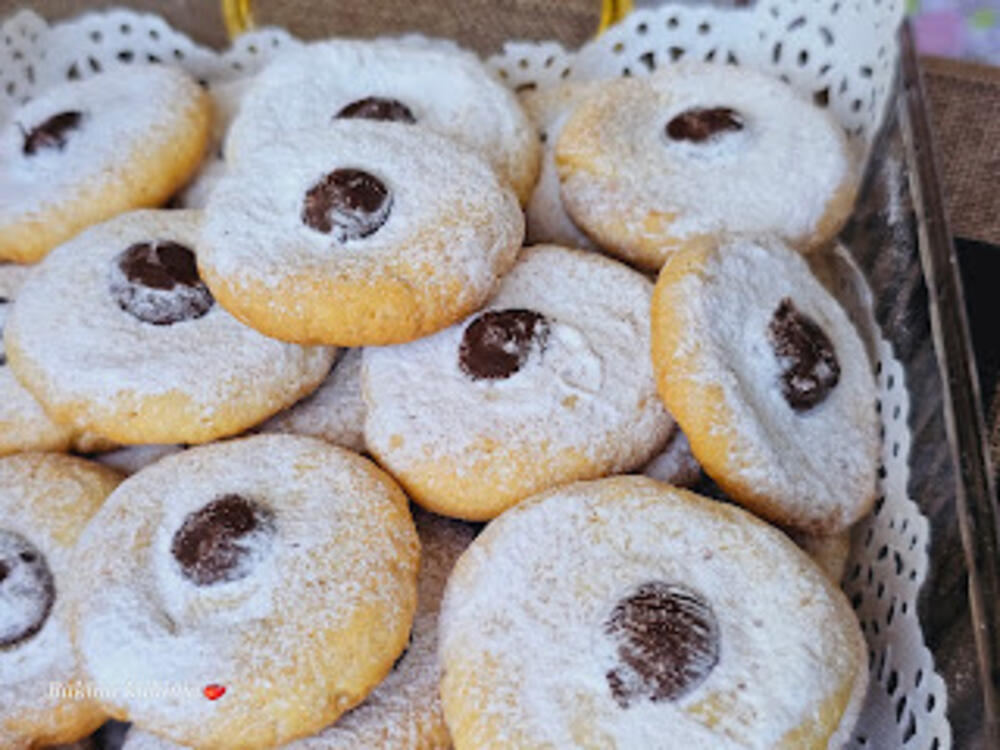 Praviti manje loptice na sredsinu ih pritisnuti i ubaciti čokoladne suze. Peći na 180 stepeni C 20 minuta. posuti prah šećerom i spakovati u kutiju.