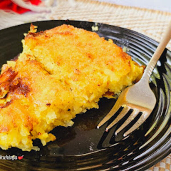 U činiju razbiti jaja, dodati ulje, jogrut, brašno ili griz i sve izjednačiti žicom. Preliti preko rendanog krompira u koji ste dodali malo začina i ml bibera. Sve izmešati.