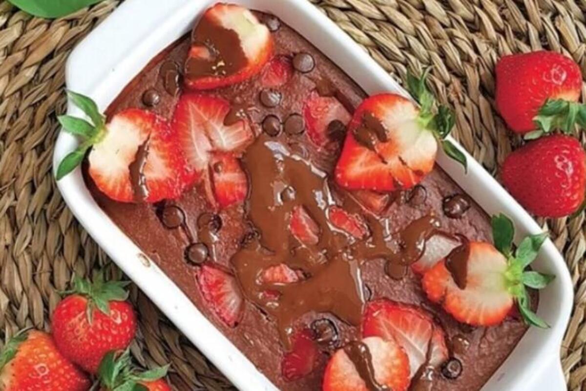 Pahuljice, bananu, grčki jogurt, mleko, kakao i prašak za pecivo izblendajte da se lepo usitni i poveže. Polovinu sipajte u posudu u kojoj ćete peći pa stavite jagode i čoko-kapljice.