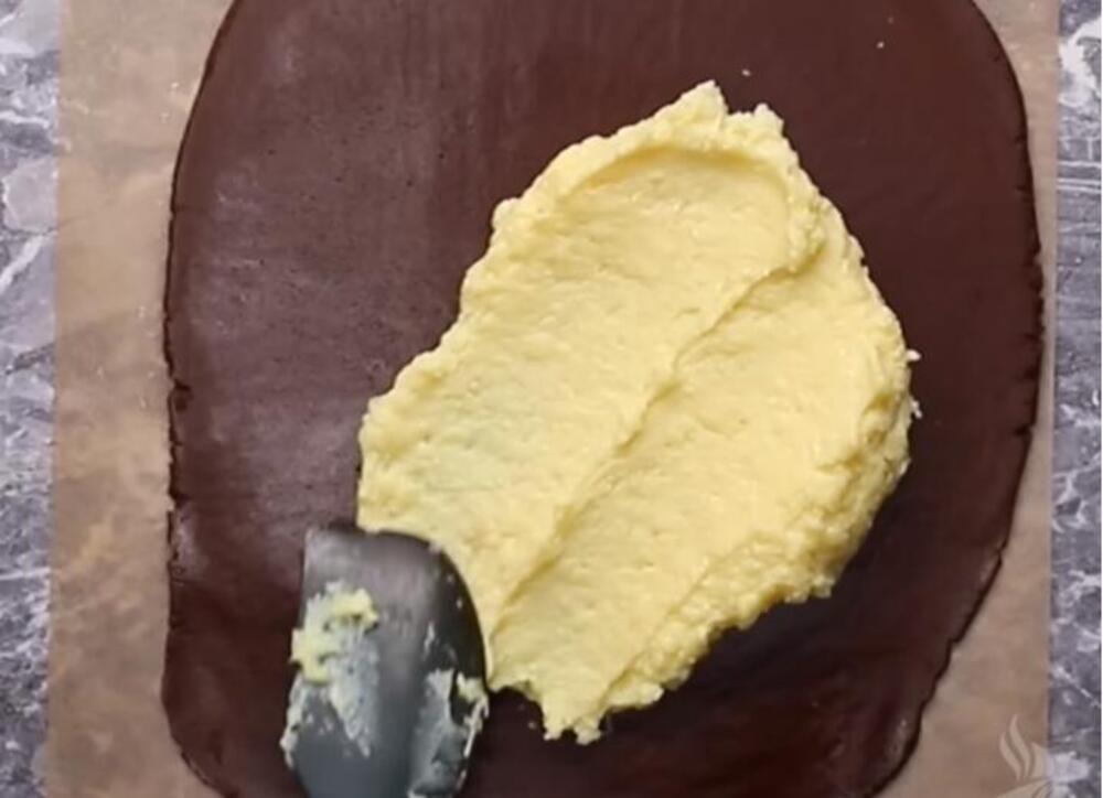 Takvu smesu razvucite po testu, potom stavite preko pek papir i ponovo pređite oklagijom (ovo će vam olakšati da se fil ne lepi za oklagiju) i rolajte u rolat.