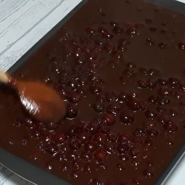 6. Prvu koru preliti sa 1 dl soka od višnje, premazati filom i posuti višnjama.
