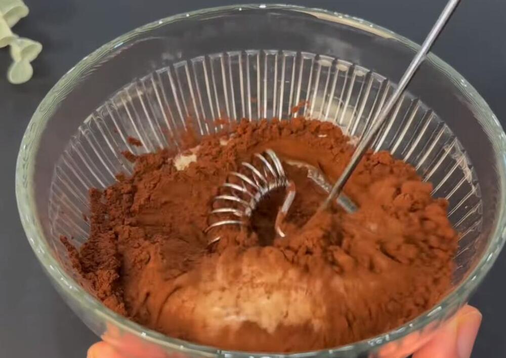 U drugu posudu sipajte slatku pavlaku i mutite mikserom, pa tome dodajte prethodnu smesu s kakaoom i nastavite da mutite.