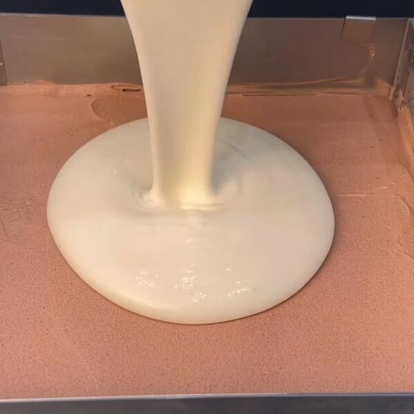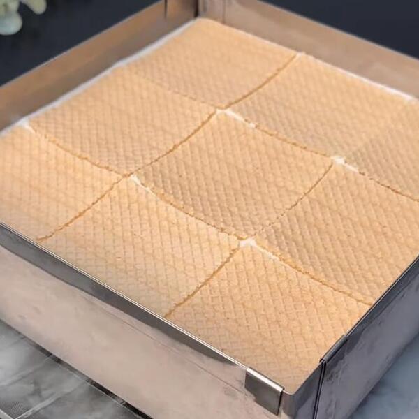 Poređajte po dnu kalupa oblandu (može sečenu na kvadrate) i prelijte je pripremljenom smesom i lepo poravnajte. Stavite u frižider na pola sata.