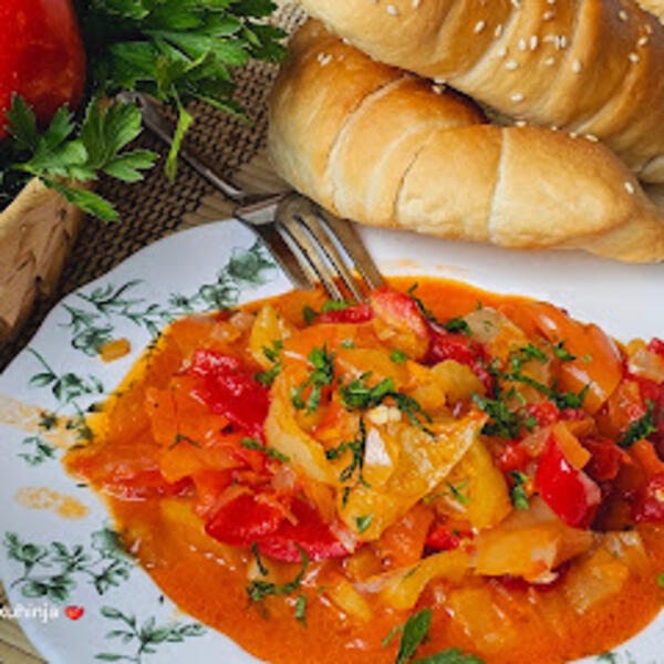 Kad postane staklast /nikako nemojte dodavati vodu/ dodati papriku secenu. Dodati suvi zači izmešati i poklopiti. Paradajz zaseći krstiće sa donje strane staviti u vodu da prostruji. Ostaviti 2 minuta pa izvaditi u hladnu vodu.