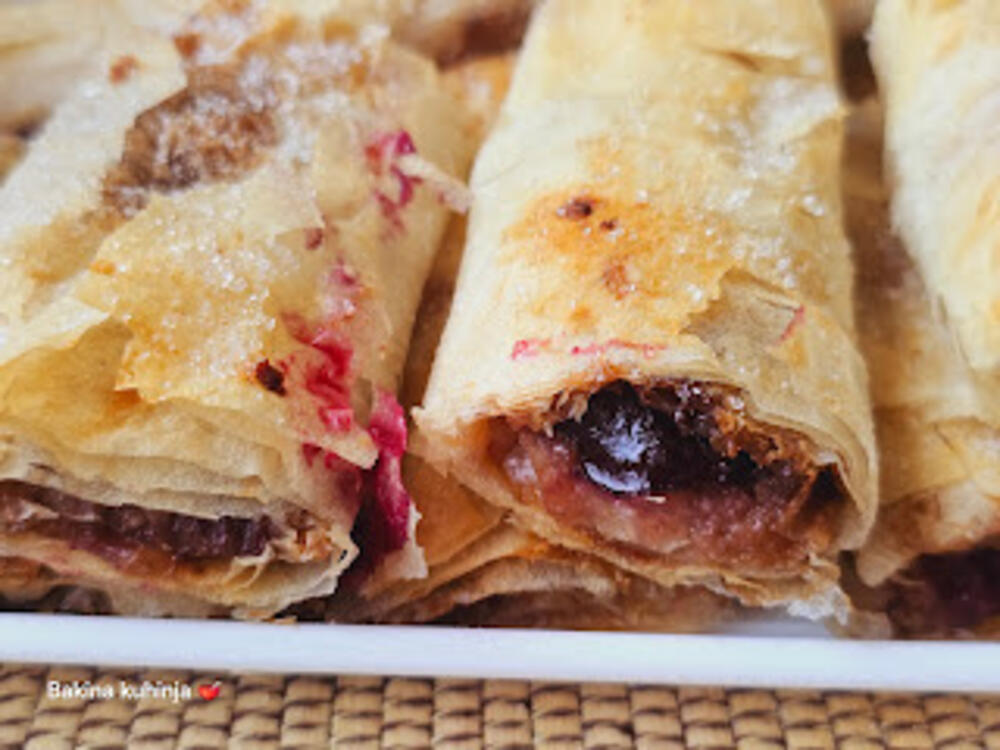 Voće rasporediti po kori i uvit. Redjati u podmazan peleh. zasećo svaku rolnicu malo da ne puca kad se seče.