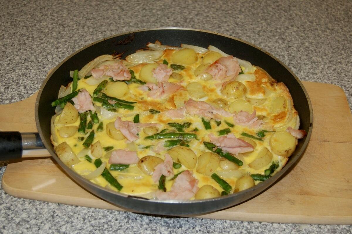 Priprema: Krompir oljuštite i iseckajte na što sitnije deliće. Potom u tiganju na malo ulja prodinstajte luk, dodajte krompir pa poklopite da se dinsta dok krompir omekša. Umutite jaja, posolite ih i pobiberite pa ih prelijte preko krompira.