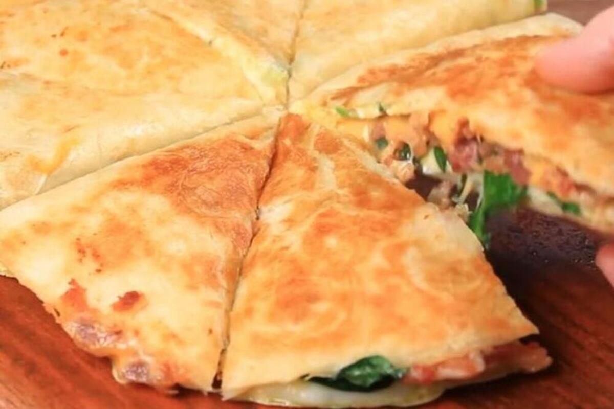 - Kada se kajgana razlije po tiganju odozgo je poklopite jednom tortiljom, pa je nakon otprilike minut okrenite na drugu stranu. Sada po drugoj strani gde se nalazi zapečeni omlet dodajte rendanu mocarelu, listove bebi spanaća, 3 koluta paradajza i 2 kriške sira za topljenje.