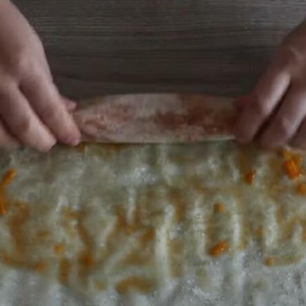 Po poslednjoj kori pospite izrendanu bundevu, pa preko nje pospite šećer i kašiku griza. Odozgo rasporedite suvo grožđe i pospite cimetom. Malo savijte bočne strane kora, pa ih savijajte zajedno sa filom u rolat. Ponovite postupak sa preostalim korama i sastojcima, dok se ne istrošite.