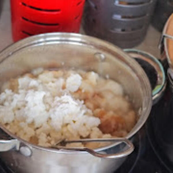 Kad provri voda dodajte oko 4 - 5 većih kriški hleba (iseći na kocke). Viljuškom ga malo isitnite u vodi da hleb upije tečnost.