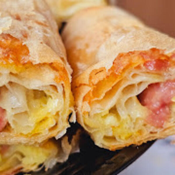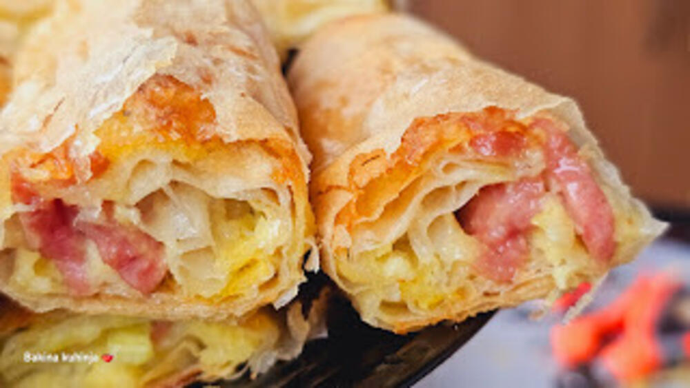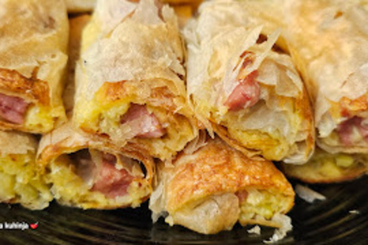 Saviti ivice i uviti u rolat. Ređati u pleh. Rolnice premazati uljem i peći na 200 stepeni C 35 minuta