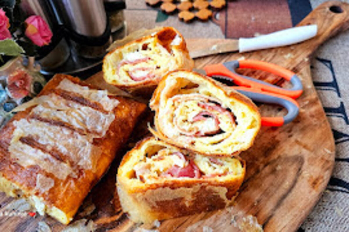 Zatim kore sa premazom, savijemo ivice i uvijemo u rolat. Zaseći malo nožem na dva prsta udaljenosti. Premazati uljem može ostatkom jaja.