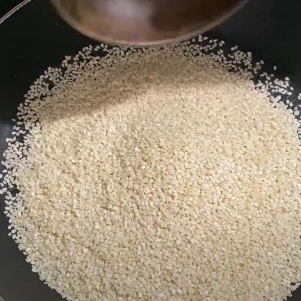 U suvom tiganju propržite susam dok ne dobije zlatnu boju, pa sklonite sa strane da se ohladi. Sir izmrvite, a šunku sitno izrendajte.