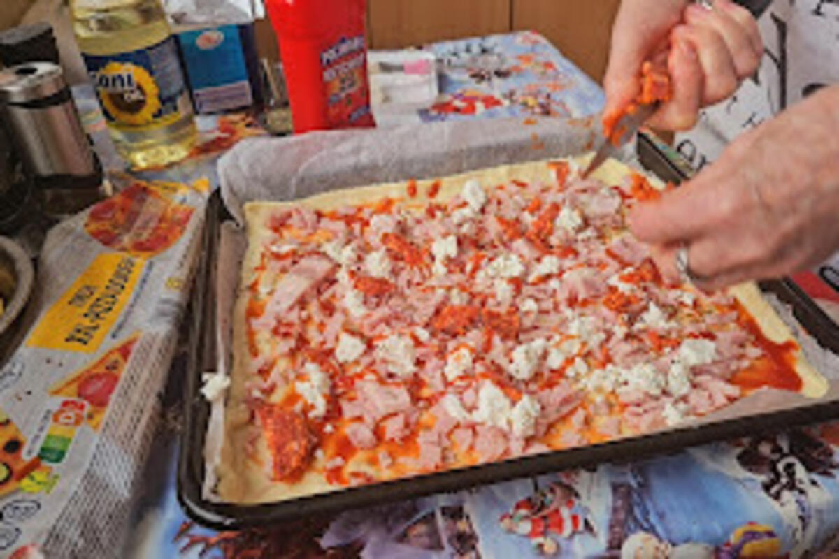 Testo staviti u tepsiju obloženu pek papirom. Premazati kečapom pa razbacati seckanu šunku i suvu slaninu, po želji naseći i malo kulena.