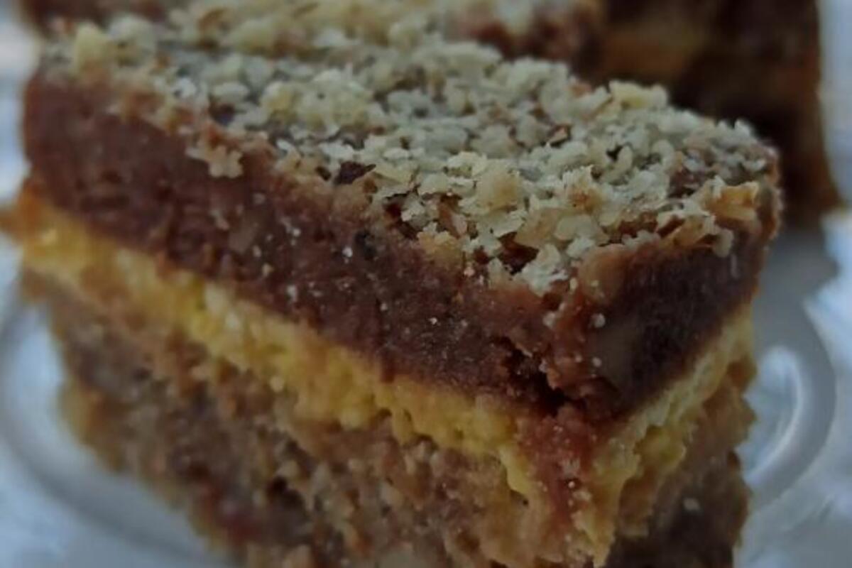 umutite 5 žumanca sa 150 gr šećera u prahu. Posle nekih petnaestak minuta pečenja kore (treba gornji sloj da dobije koricu, da je čvrst) izvadite pleh i preko kore izlite žuti deo preko celog kolača. Pleh vratite u rernu i nastavite da pečete kolač, ali temperaturu smanjite na nekih 100-120'C jer žumanca treba da se "osuše" a ne da se ispeku. Svakako će biti čvrsta "korica" od žumanca. Sušite kolač još nekih petnaestak minuta. Gotov kolač izvadite iz rerne i ostavite da se ohladi. Za to vreme pripremite završni sloj.
