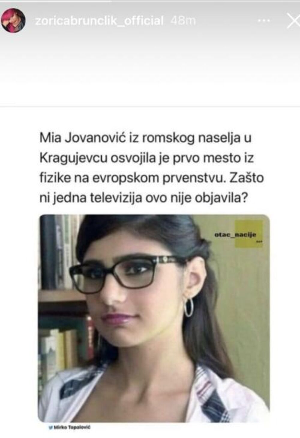 Bila je pre nekoliko godina hit na mrežama u Srbiji nakon što je pevačica Zorica Brunclik objavila njenu sliku na svom Instagram profilu uz komentar da se radi o talentovanoj učenici koja je osvojila nagradu na takmičenju iz fizike. Ta poruka je bila mim, za mnoge i prilično neumesan, a Zorica je sigurno iz najbolje namere i u neznanju ko je na fotografiji šerovala objavu.