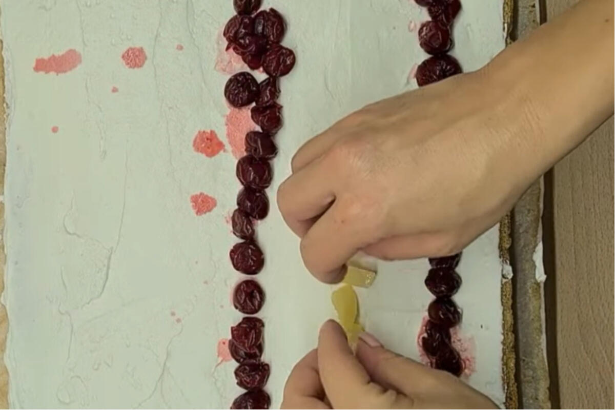 Kada se kolač ohladi na sobnoj temperaturiu, odmotajte ga i ravnomerno premažite filom. Po površnini posipajte oceđene višnje. Urolajte patišpanj, prebacite ga na tanjir za serviranje i obilno ga pospite šećerom u prahu.
