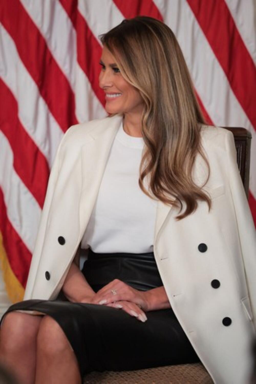 Melanija Tramp se za ovu priliku odlučila da ponese belu bluzu koja je uvek savršen izbor za zvanične obaveze i kožnu midi suknju crne boje. Naravno, tu su i salonke tamne boje koje su svakako prepoznatljiv znak Prve dame. Kosu je odlučila da ovog puta pusti preko ramena, što je bio pun pogodak za ovu zgodu.