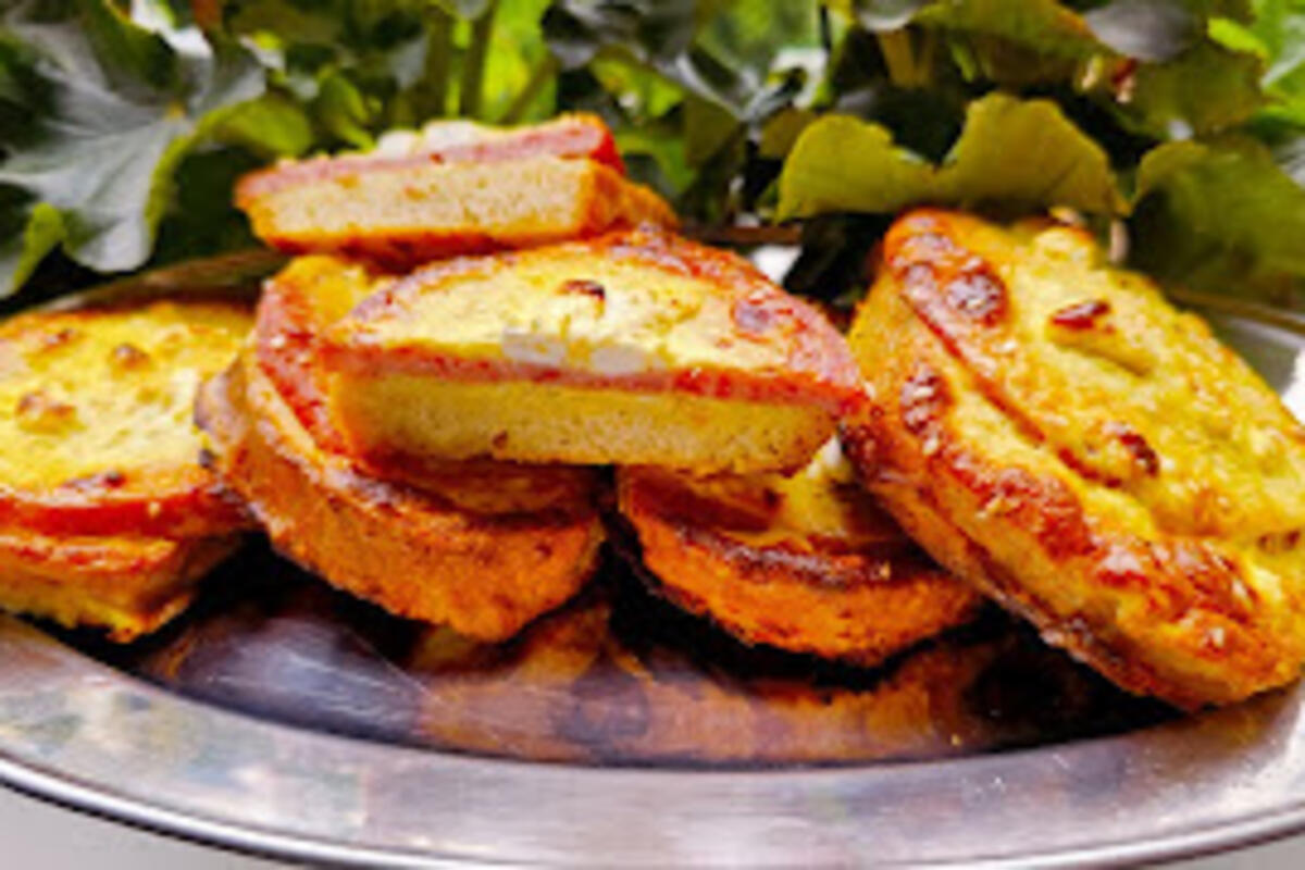 Hleb umočiti u jaja sa jedne i druge strane i ređati u pleh. Odozgo staviti list šunke pa sipati ostatak preliva.