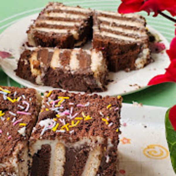 Ova brza i jeftina torta spaja tamni i svetli keks sa kremastim filovima od čokolade i slatke pavlake.