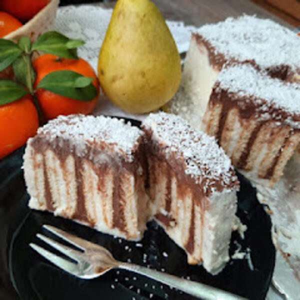 Sa strane posuti kokos a odozgo rendanom čokoladom Ostaviti preko noći da keks upije i torta se malo stegne.