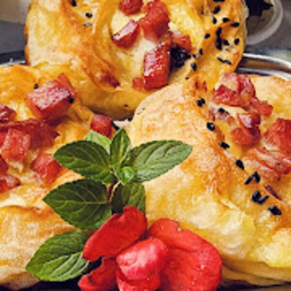 U sredinu ubacite po malo kockice šunke, a oko rolatića dodajte malo crnog susama. Pecite na 200 stepeni C 30 minuta da lepo zarumeni.