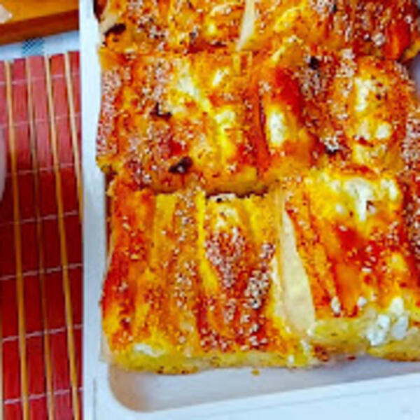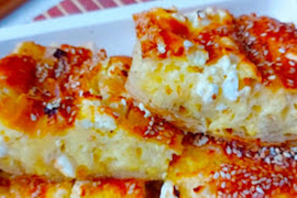 Poredajte je u podmazan pleh. Sir izdrobiti, dodati malo ulja, prašak za pecivo, jaja i mleko, a zatim sve izjednačiti. Ostatak preliti preko presavijenih kora.