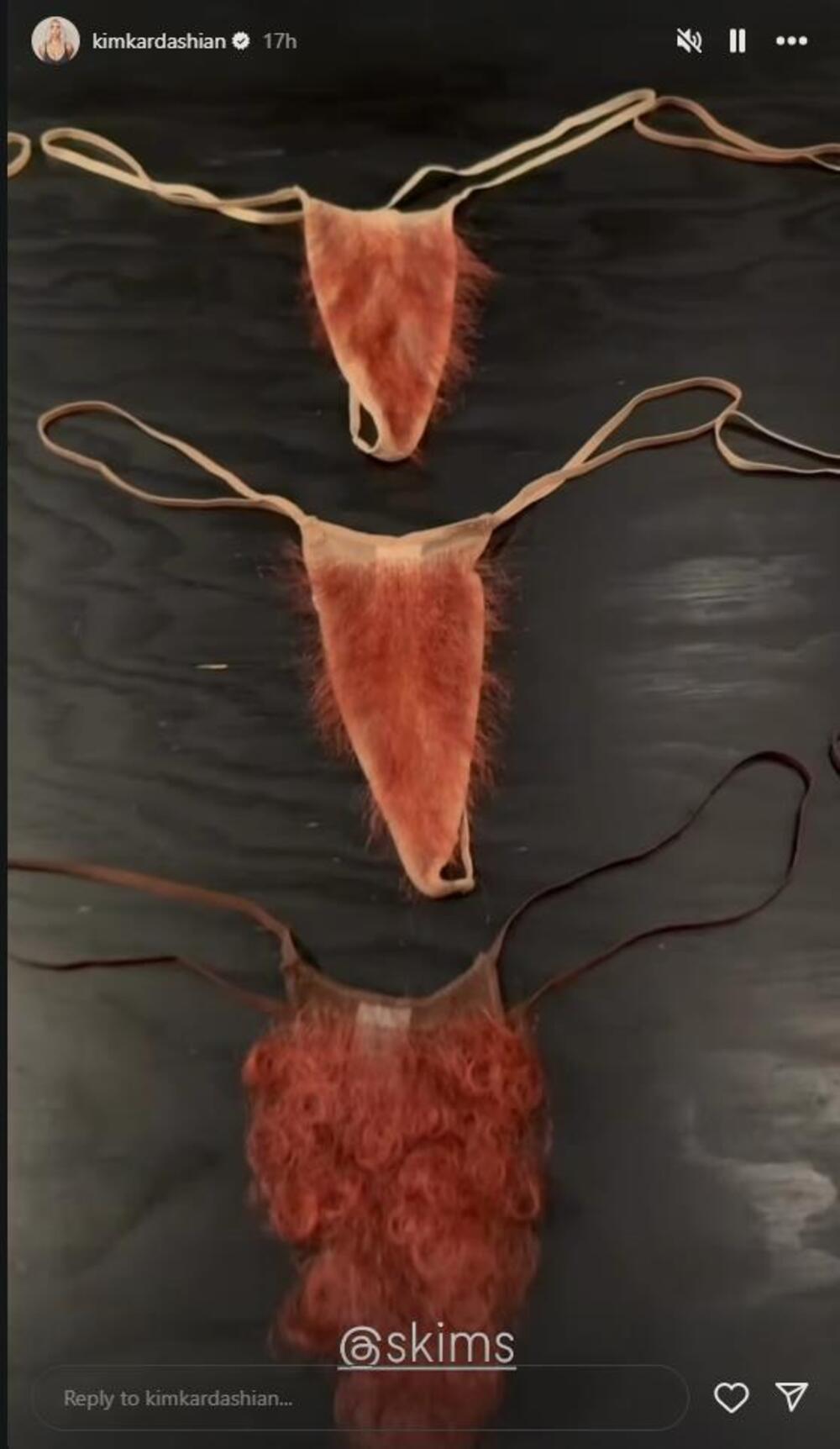 Kompanija Kim Kardašijan, SKIMS, izbacila je svoj dosad najkontroverzniji proizvod – liniju mikro tanga gaćica sa lažnim stidnim dlakama, dostupnim u crvenoj, plavoj i braon boji, kao i u ravnoj i kovrdžavoj teksturi.