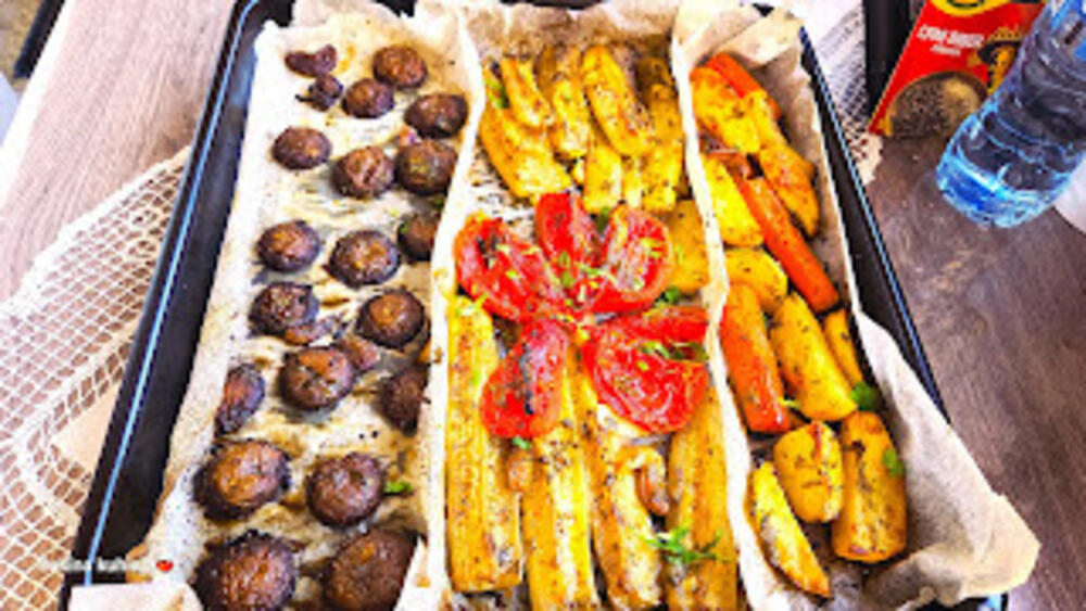 NAPOMENA: Šampinjone ne začinjati suvim začinima. Sve dobro izmešati rukama da se začini ravnomerno rasporede po svakom komadu. Pleh za pečenje obložiti papirom za pečenje i rasporediti povrće. Peći dok ne dobije lepu zlatnu boju. Služiti toplo uz posnu čorbu i integralni hleb.