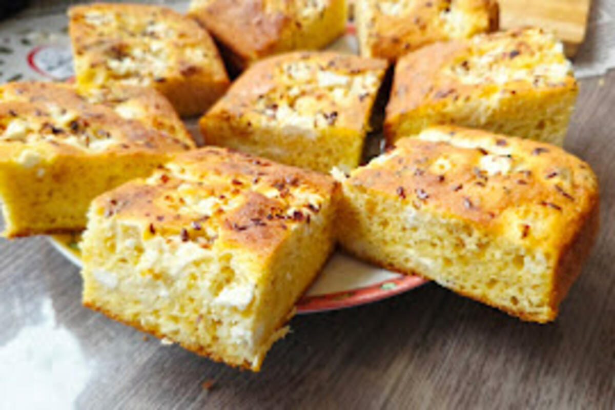 5 jaja, 2 šolje od 200 g kukuruznog brašna, 2 pune kašike griza, 100 ml ulja, 1 šolja kiselog mleka razbijenog žicom, 50 ml kisele vode, 1 prašak za pecivo, malo soli, 2 kašike lanenog semena, 100 g izgnječenog sira za testo, još 100 g sira za odozgo, tucana ljuta paprika.