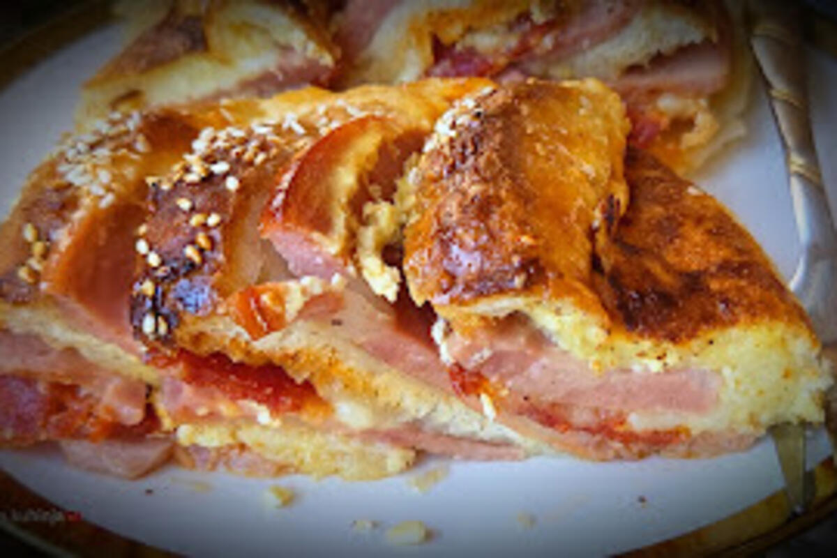Prvo umutite jaja i u njih dodajte oko 50 grama izdrobljenog sira, jogurt i malo ulja, pa sve to dobro izjednačite i ostavite sa strane. Stari hleb isecite na tanje kriške i poređajte ih u pleh, a između svakog parčeta ubacite po jednu krišku šunkarice i malo parče kulena koliko da zamiriše.