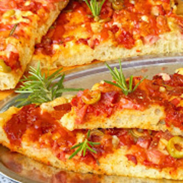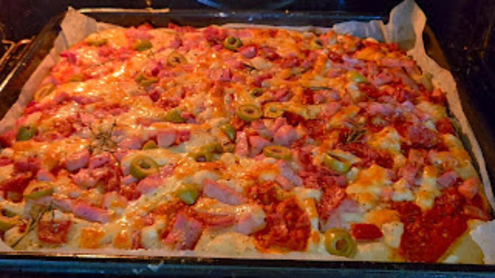 500 g brašna. 400 ml mlake vode. 20 g kvasca. malo soli. 1 kašičica šećera. beli luk. malo ulja. 2 pune kašike ajvara 2 kaćije kuvanog paradajza . maslinovo ulje. seckana šunka na štapiće. šaka zelenih maslina bez koštice. oko 50 g kačkavalja. 50 gr suve slanine