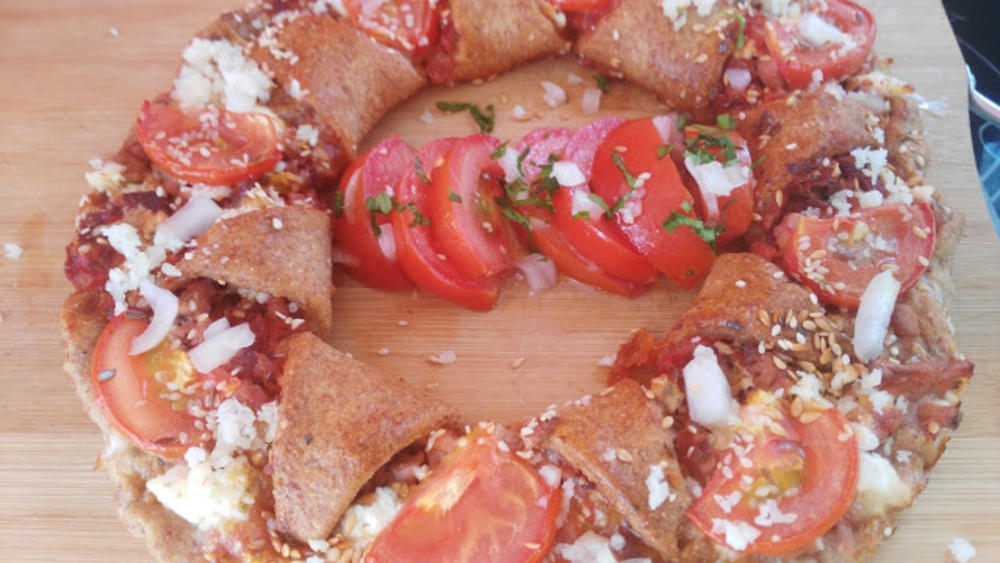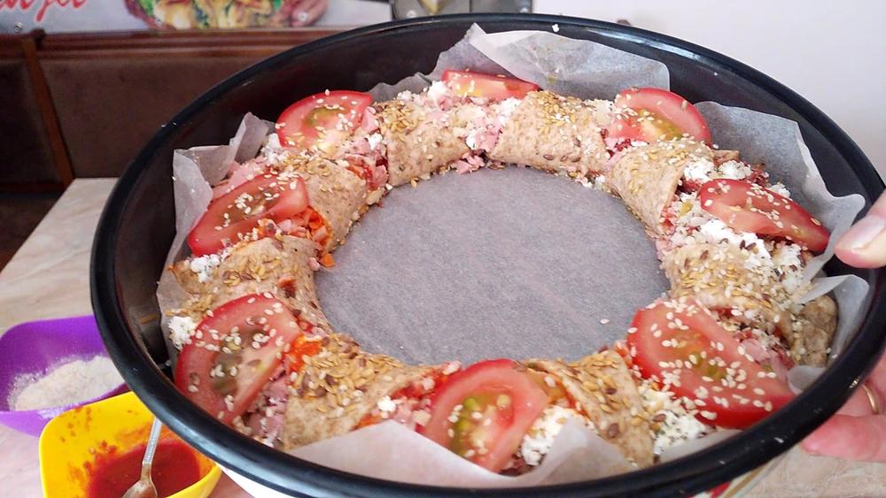 Hvatati svaki trougao iz sredine i prebaciti preko nadeva i pritisnuti na ivicu testa i tako u krug. Picu sa papirom prebaciti u pleh namazati trouglove uljem i posuti semenkicama i krupnom solju. Može se dodati i svežeg paradajza po kriška. Peći na 200 stepeni C 30 min.