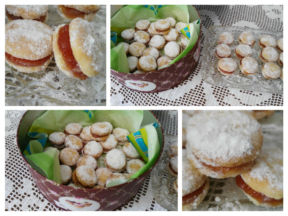 Peći na 180 stepeni C 10-15 min. Spajati po dve tako što ih premažete džemom po izboru. Uvaljati u šećer u prahu pomešan sa vanilom.