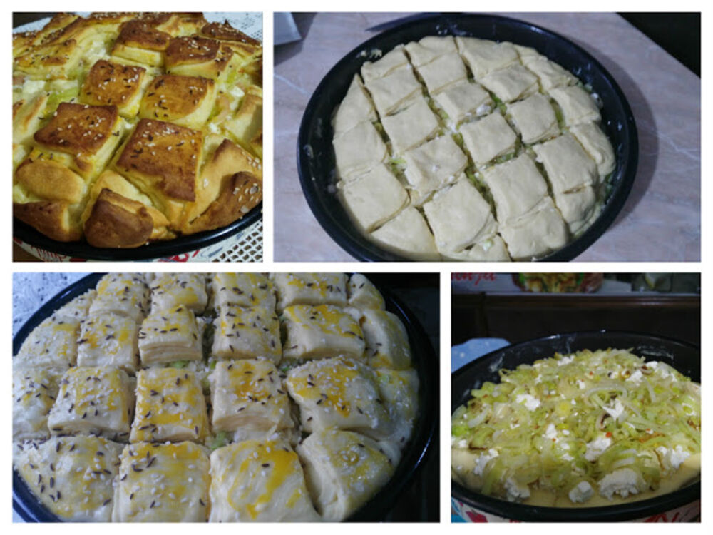 Kvasac potopiti u mlako mleko, dodati jaja šećer, jogurt, brašno ,so i zamesiti glatko testo, ali ne mnogo tvrdo i pustiti da odstoji 30 minuta. Praziluk iseći na tanke kolutiće i propržiti na ulju, dodati začin, biber, beli luk i so. Kad naraste, testo obraditi rukama i odvojiti 9 loptica. Prvu lopticu razviti na veličinu 24 centimetra, pa premazati je otopljenim margarinom. Staviti u podmazanu tepsiju. Razviti drugu i treću lopticu koju isto tako treba premazati i stavljati jednu preko druge.
