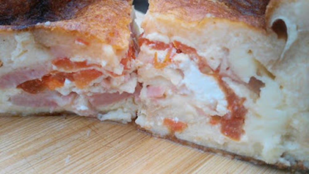 Priprema: Kalup prmažite malo uljem, pa poređajte po hleb po ivici, zatim šunku, pa kačkavalj, paradajz i sir, završite sa hlebom i pokrijte hlebom. Razbijte jaja, dodajte jogurt dobro izmešajte i prelijte hleb, pa po vrhu poređajte listiće kačkavalja i pospite susamom. Pecite na 200 stepeni C oko 30-40 minuta da lepo porumeni.