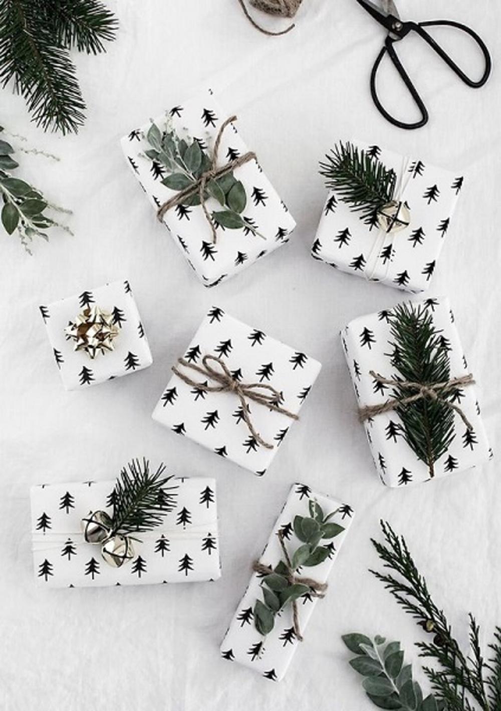 1. Beli ukrasni papir sa novogodišnjim motivima, građevinski kanap i par grančica neke zimzelene biljke je sve što vam je potrebno da vaš poklon izgleda savršeno!