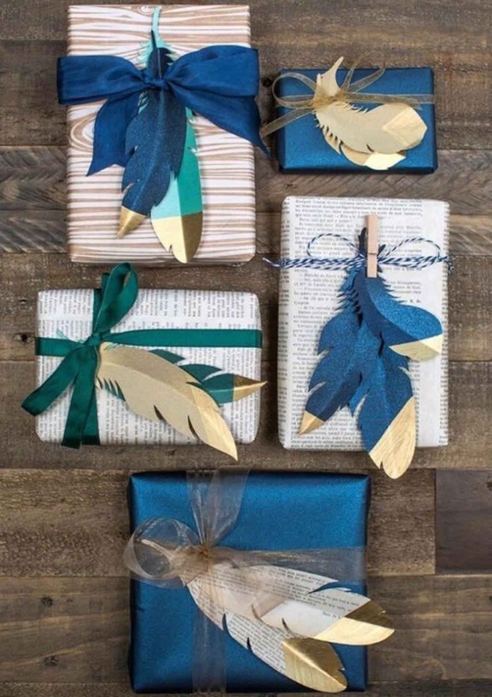 9. Perije već dugo ne izlazi iz mode. Ukrasite neko pero zlatnim lakom, šljokicama, ili jednostavno izrežite pero od kolaža ili kartona u boji, prikačite ga mašnom za poklon i dobili ste savršenstvo!