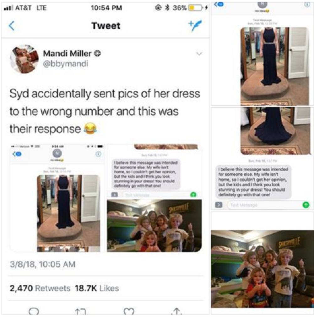 Sidni Juselton je poslala fotografiju sebe u haljini, misleći da traži savet od drugarice Mendi. Međutim, pogrešila je broj. Nedugo zatim stigla joj je povratna poruka koja je glasila: "Verujem da ste hteli nekom drugom da pošaljete poruku. Moja žena nije kod kuće pa ne mogu da je pitam za mišljenje ali deca i ja mislimo da izgledaš veoma dobro! Definitivno treba da se odlučiš za tu haljinu!" Nije teško biti fin. Toni je okupio svoje petoro dece koji su pokazali palčeve kao znak da haljina kida. Kada je Sindi šerovala dopisivanje koje je postalo globalni viral, jedan od korisnika primetio je da Tonijev 4-godišnji sin nije na fotografiji.