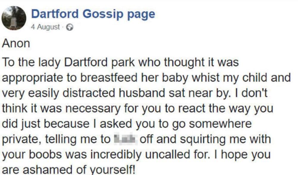 Jedna žena se na društvenim mrežama požalila na mamu koja je dojila u javnosti pred njenim mužem kojem je "lako odvući pažnju" i odlučila da joj pošalje ljutitu poruku. Iako je verovatno očekivala da će dobiti podršku javnosti, dobila je upravo suprotno.