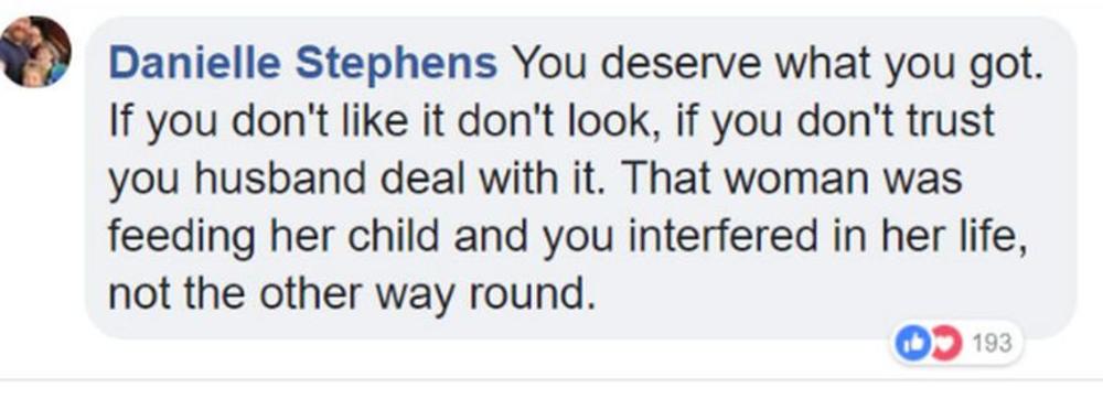 "Nisi valjda ozbiljna? Dete ne bi trebalo da jede jer je tvom mužu lako odvući pažnju? Zar nikad nije video sisu? Možda bi trebala da mu pokažeš svoju pa mu ubuduće tuđe neće odvraćati pažnju. Ako je istina da te poprskala, to mi je ulepšalo nedelju."