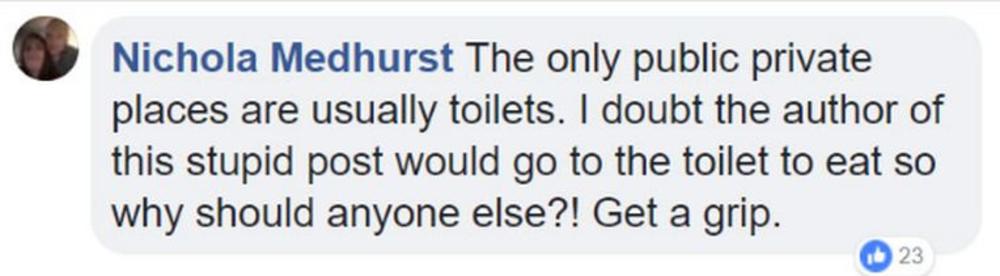 "Jedina intimnija mesta na javnim površinama su obično toaleti. Sumnjam da bi autorka ove glupe objave išla da jede u toalet, pa zašto bi onda neko drugi. Saberi se."