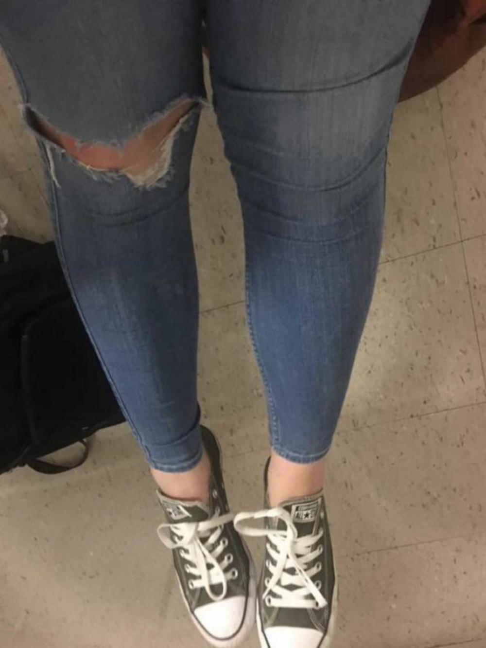 Moja ćerka je obukla farmerke za školu, a imale su rupu na kolenu.