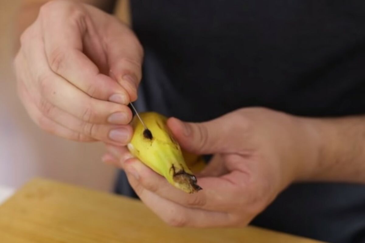 Pri vrhu banane zabodite iglu u koru i okrećite je levo desno praveći mali rez na kori banane.