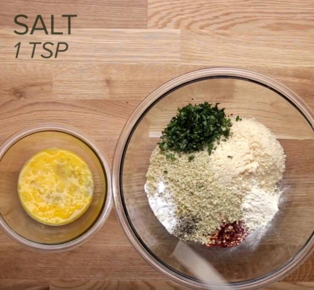 2-3 tikvice 2 hlebnih mrvica pomešanih sa susamom ¾ šolje parmezana ⅓ šolja svežeg bosiljka 1 kašika belog luka u prahu ½ kašičice soli 1 kašičica bibera 1 ½ kašičica začinske paprike 2 jaja